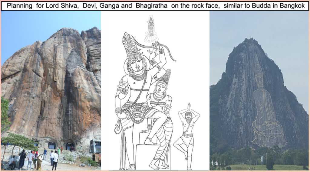 The sketch in the middle is the actual plan of action to be implemented which has Lord Shiva, Devi Ganga and Bhagiratha on the rock face in kailasagiri cave temple as shown in the image to the left side which is implemented in Bangkok.